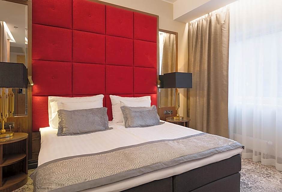 Deluxe room with a flat-screen LED TV, mini-bar and coffee maker. Private bathroom with glass walls is equipped with a spa bath, toiletries, bathrobes and slippers.